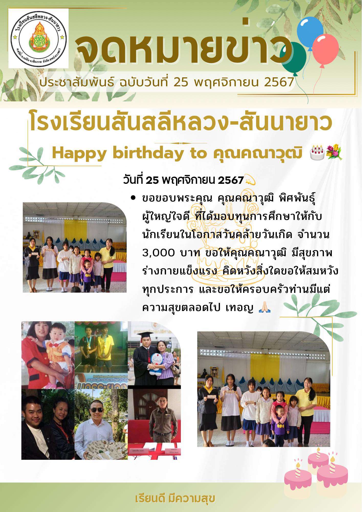 ขอขอบพระคุณ คุณคณาวุฒิ พิศพันธุ์ ผู้ใหญ่ใจดี ที่ได้มอบทุนการศึกษาให้กับนักเรียนในโอกาสวันคล้ายวันเกิด จำนวน 3,000 บาท ขอให้คุณคณาวุฒิ มีสุขภาพร่างกายแข็งแรง คิดหวังสิ่งใดขอให้สมหวังทุกประการ และขอให้ครอบครัวท่านมีแต่ความสุขตลอดไป เทอญ