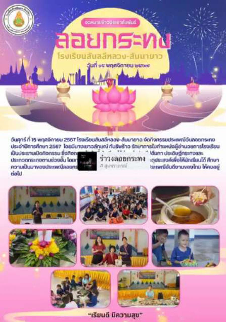 วันศุกร์ ที่ 15 พฤศจิกายน 2567 โรงเรียนสันสลีหลวง-สันนายาว จัดกิจกรรมประเพณีวันลอยกระทง ประจำปีการศึกษา 2567 โดยมีนางเยาวลักษณ์ กันธิพร้าว รักษาการในตำแหน่งผู้อำนวยการโรงเรียนเป็นประธานเปิดกิจกรรม ซึ่งกิจกรรมในวันนี้ นักเรียนได้ร่วมทำประทีปตีนกา ประดิษฐ์กระทงและประกวดกระทงตามช่วงชั้น โดยการจัดกิจกรรมวันลอยกระทงนี้ มีวัตถุประสงค์เพื่อให้นักเรียนได้ ศึกษาความเป็นมาของประเพณีลอยกระทง อนุรักษ์และสืบสานวัฒนธรรมประเพณีอันดีงามของไทย ให้คงอยู่ต่อไป