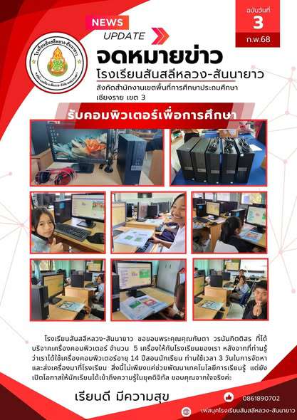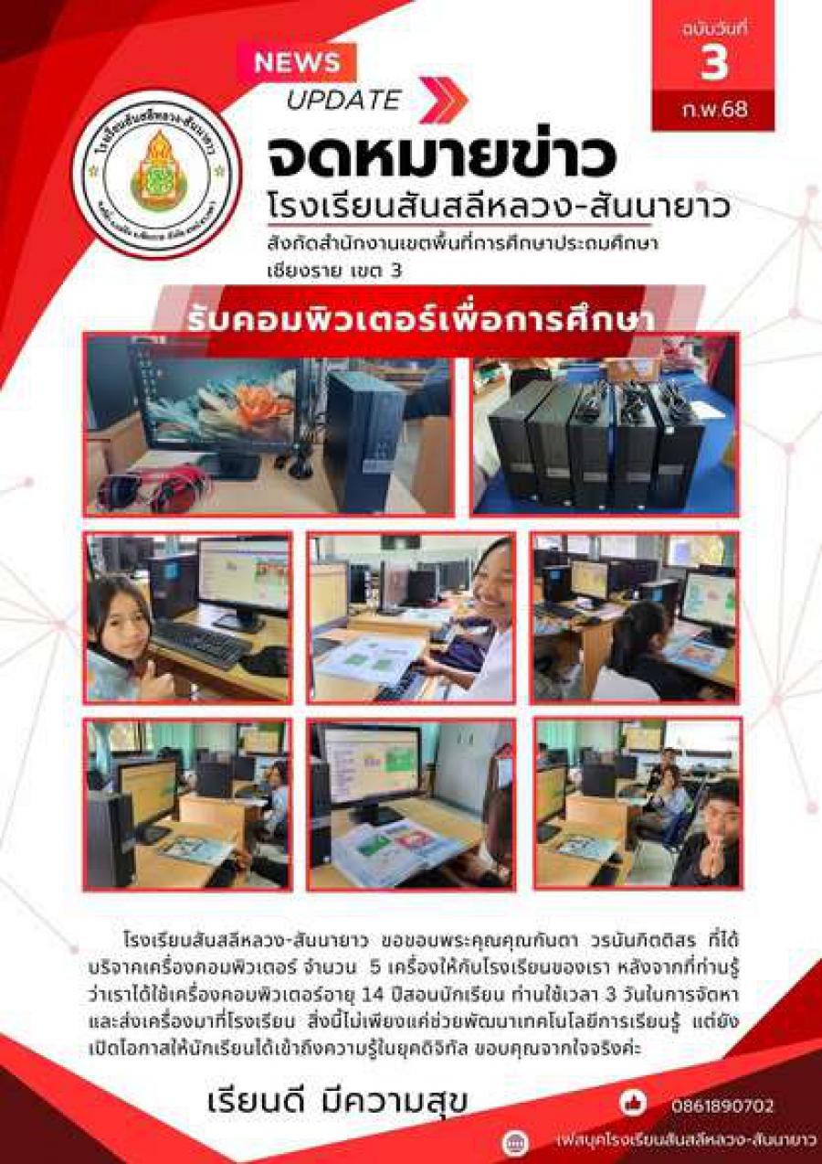 โรงเรียนสันสลีหลวง-สันนายาว ขอขอบพระคุณคุณกันตา วรนันกิตติสร ที่ได้บริจาคเครื่องคอมพิวเตอร์ จำนวน 5 เครื่องให้กับโรงเรียนของเรา หลังจากที่ท่านรู้ว่าเรา ได้ใช้เครื่องคอมพิวเตอร์อายุ 14 ปีสอนนักเรียน ท่านใช้เวลา 3 วันในการจัดหาและส่งเครื่องมาที่โรงเรียน สิ่งนี้ไม่เพียงแค่ช่วยพัฒนาเทคโนโลยีการเรียนรู้ แต่ยังเปิดโอกาสให้นักเรียนได้เข้าถึงความรู้ในยุคดิจิทัล ขอบคุณจากใจจริงค่ะ