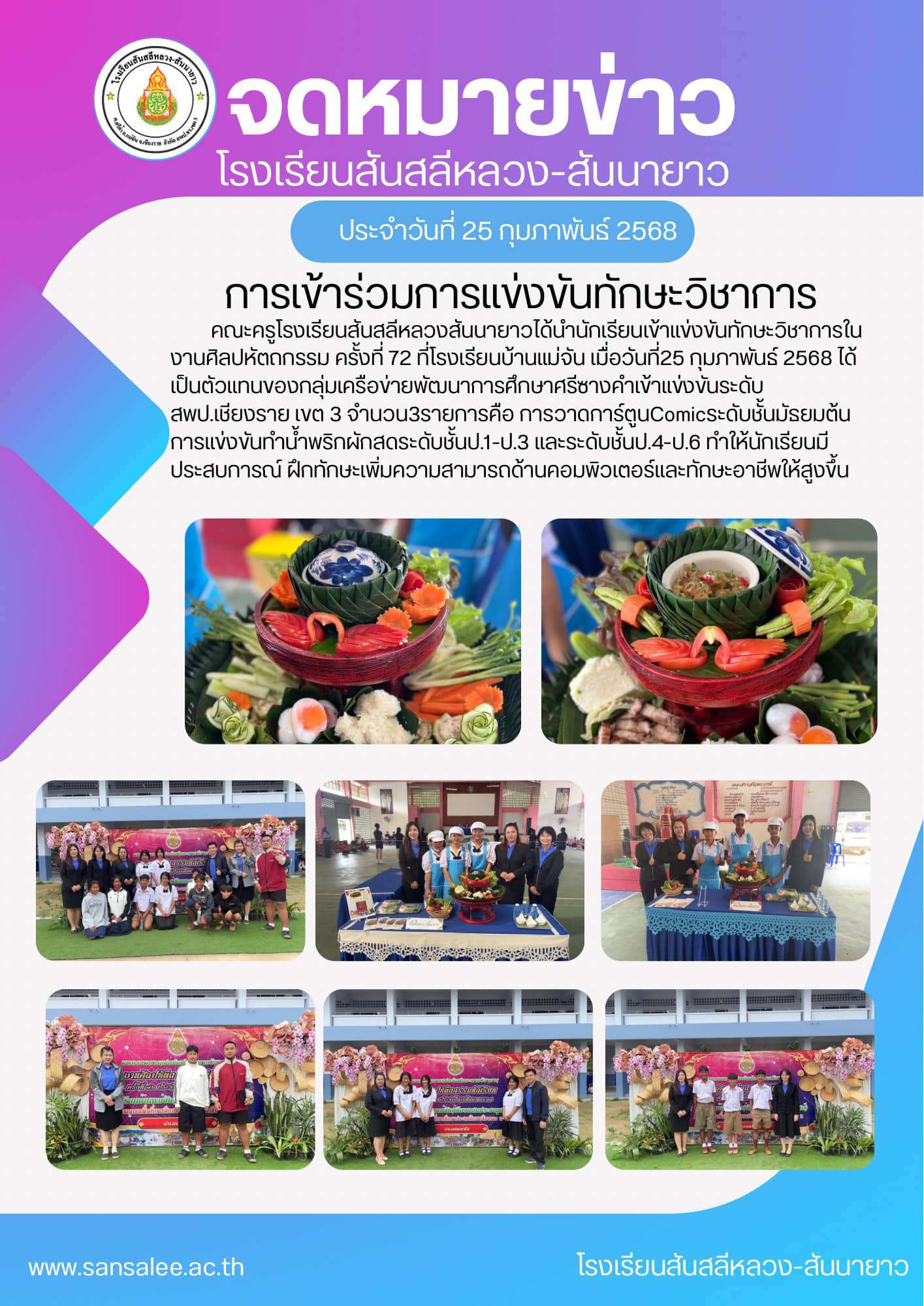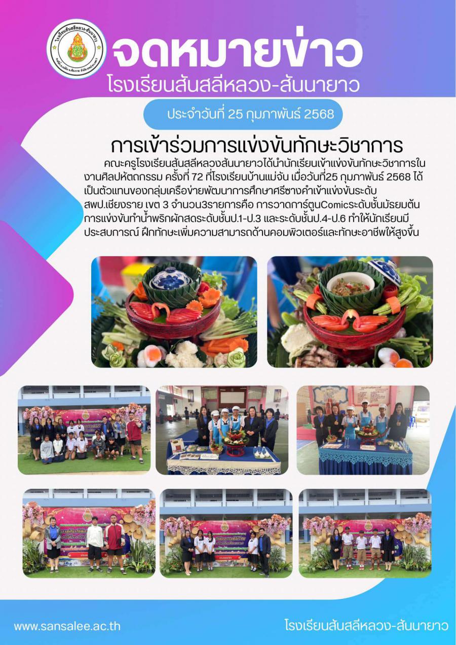 คณะครูโรงเรียนสันสลีหลวงสันนายาวได้นำนักเรียนเข้าแข่งขันทักษะวิชาการในงานศิลปหัตถกรรม ครั้งที่ 72 ที่โรงเรียนบ้านแม่จัน เมื่ิอวันที่25 กุมภาพันธ์ 2568 ได้เป็นตัวแทนของกลุ่มเครือข่ายพัฒนาการศึกษาศรีซางคำเข้าแข่งขันระดับสพป.เชียงราย เขต 3 จำนวน3รายการคือ การวาดการ์ตูนComicระดับชั้นมัธยมต้น การแข่งขันทำน้ำพริกผักสดระดับชั้นป.1-ป.3 และระดับชั้นป.4-ป.6 ทำให้นักเรียนมีประสบการณ์ ฝึกทักษะเพิ่มความสามารถด้านคอมพิวเตอร์และทักษะอาชีพให้สูงขึ้น
