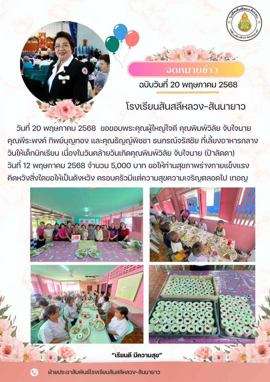 ขอขอบพระคุณผู้ใหญ่ใจดี คุณพิมพ์วิลัย จับใจนาย คุณพีระพงค์ ทิพย์บุญทอง และคุณธัญญ์พิชชา ธนกรณ์จรัสชัย ที่เลี้ยงอาหารกลางวันให้เด็กนักเรียน เนื่องในวันคล้ายวันเกิดคุณพิมพ์วิลัย จับใจนาย (ป้าลัดดา) วันที่ 12 พฤษภาคม 2568 จำนวน 5,000 บาท ขอให้ท่านสุขภาพร่างกายแข็งแรง คิดหวังสิ่งใดขอให้เป็นดังหวัง ครอบครัวมีแต่ความสุขความเจริญตลอดไป เทอญ