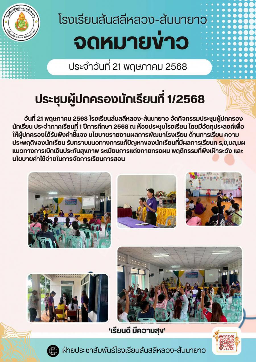 วันที่ 21 พฤษภาคม 2568 โรงเรียนสันสลีหลวง-สันนายาว จัดกิจกรรมประชุมผู้ปกครองนักเรียน ประจำภาคเรียนที่ 1 ปีการศึกษา 2568 ณ ห้องประชุมโรงเรียน โดยมีวัตถุประสงค์เพื่อให้ผู้ปกครองได้รับฟังคำชี้แจง นโยบายรายงานผลการพัฒนาโรงเรียน ด้านการเรียนความประพฤติของนักเรียน รับทราบแนวทางการแก้ปัญหาของนักเรียนที่มีผลการเรียนติด 0,ร,มส,มผ แนวทางการเบิกเงินประกันสุขภาพ ระเบียบการแต่งกายทรงผม พฤติกรรมที่พึงเฝ้าระวัง และนโยบายค่าใช้จ่ายในการจัดการเรียนการสอน