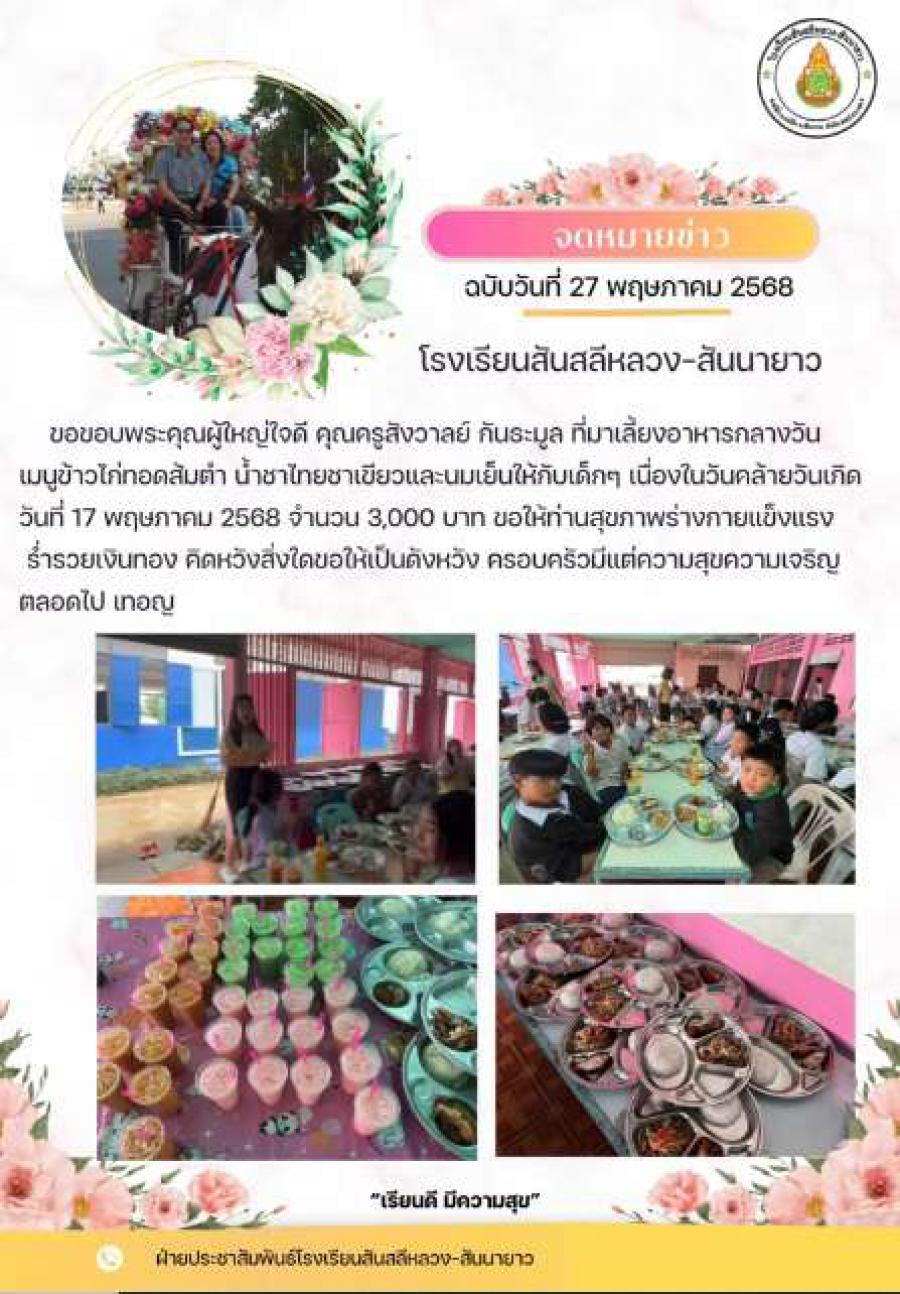 ขอขอบพระคุณผู้ใหญ่ใจดี คุณครูสังวาลย์ กันธะมูล ที่มาเลี้ยงอาหารกลางวัน เมนูข้าวไก่ทอดส้มตำ น้ำชาไทยชาเขียวและนมเย็นให้กับเด็กๆ เนื่องในวันคล้ายวันเกิด ในวันที่ 17 พฤษภาคม 2568 จำนวน 3,000 บาท ขอให้ท่านสุขภาพร่างกายแข็งแรง ร่ำรวยเงินทอง คิดหวังสิ่งใดขอให้เป็นดังหวัง ครอบครัวมีแต่ความสุขความเจริญตลอดไป