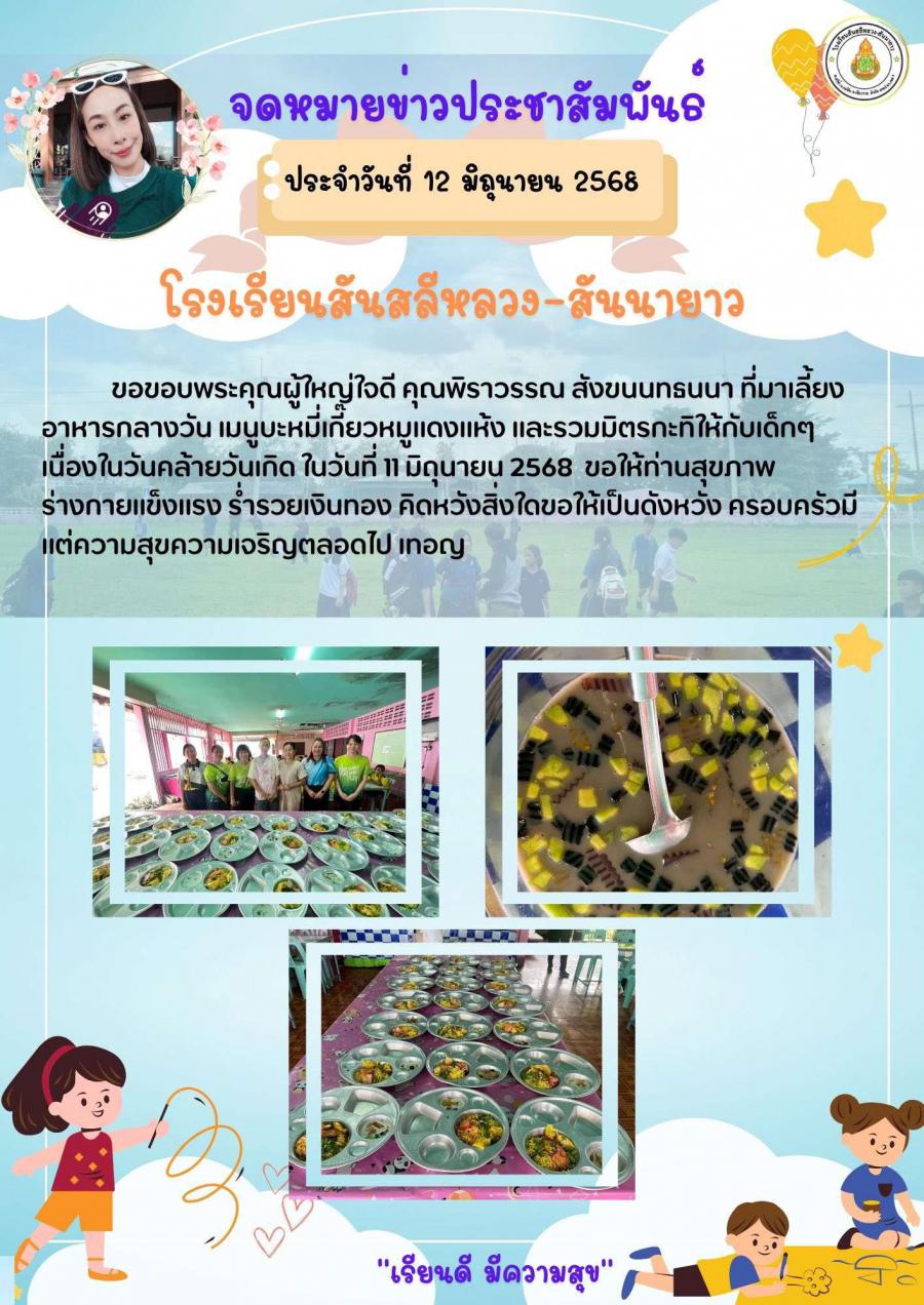 ขอขอบพระคุณผู้ใหญ่ใจดี คุณพิราวรรณ สังขนนทธนนา ที่มาเลี้ยงอาหารกลางวัน เมนูบะหมี่เกี๊ยวหมูแดงแห้ง และรวมมิตรกะทิให้กับเด็กๆ เนื่องในวันคล้ายวันเกิด ในวันที่ 11 มิถุนายน 2568 ขอให้ท่านสุขภาพร่างกายแข็งแรง ร่ำรวยเงินทอง คิดหวังสิ่งใดขอให้เป็นดังหวัง ครอบครัวมีแต่ความสุขความเจริญตลอดไป เทอญ