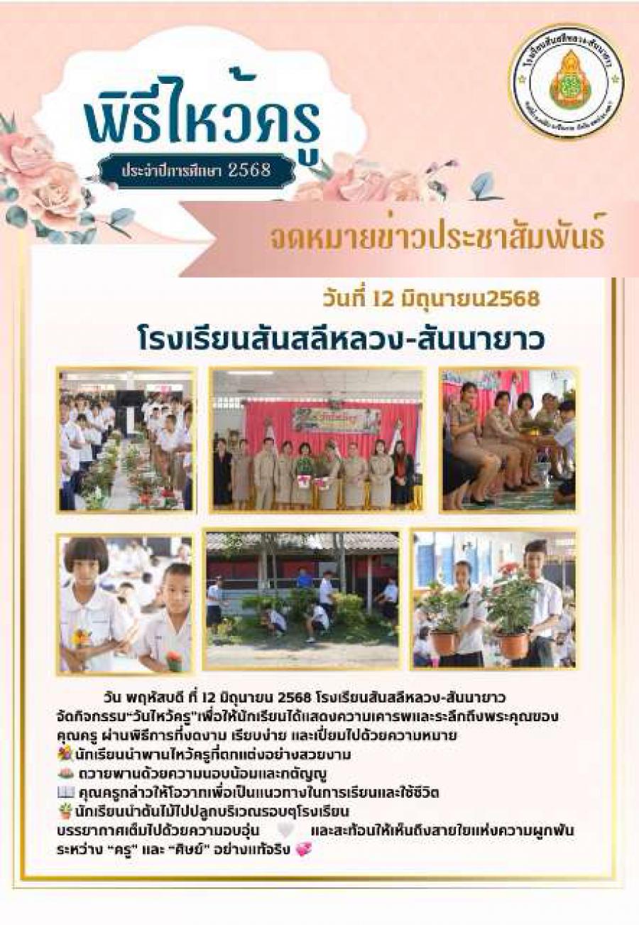 โรงเรียนสันสลีหลวง-สันนายาว ได้จัดกิจกรรม “วันไหว้ครู” เพื่อให้นักเรียนได้แสดงความเคารพและระลึกถึงพระคุณของคุณครู ผ่านพิธีการที่งดงาม เรียบง่าย และเปี่ยมไปด้วยความหมาย