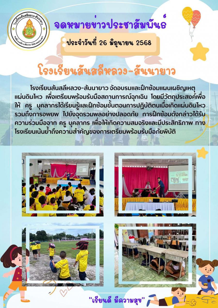 โรงเรียนสันสลีหลวง-สันนายาว จัดอบรมและฝึกซ้อมแผนเผชิญเหตุแผ่นดินไหว เพื่อเตรียมพร้อมรับมือสถานการณ์ฉุกเฉิน โดยมีวัตถุประสงค์เพื่อให้นักเรียน ครู และบุคลากรในโรงเรียน ได้เรียนรู้และฝึกซ้อมขั้นตอนการปฏิบัติตนเมื่อเกิดแผ่นดินไหว รวมถึงการอพยพ ไปยังจุดรวมพลอย่างปลอดภัย การฝึกซ้อมดังกล่าวได้รับความร่วมมือจากนักเรียน ครู และบุคลากรในโรงเรียน เพื่อให้เกิดความสมจริงและมีประสิทธิภาพ ทางโรงเรียนเน้นย้ำถึงความสำคัญของการเตรียมพร้อมรับมือภัยพิบัติ
